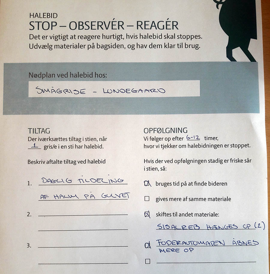 Med en handlingsplan ved du og dine kolleger, hvordan og hvornår I skal reagere, hvis grisene bider haler. Hæng den udfyldte handlingsplan op i stalden, så alle kan se, hvad der er aftalt.